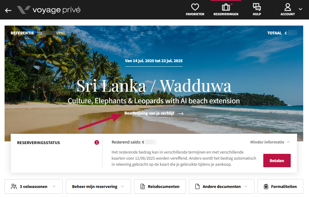 Je kunt de productpagina terugvinden door te klikken op de link Beschrijving van je verblijf via het gedeelte Reserveringen. Om deze te raadplegen: