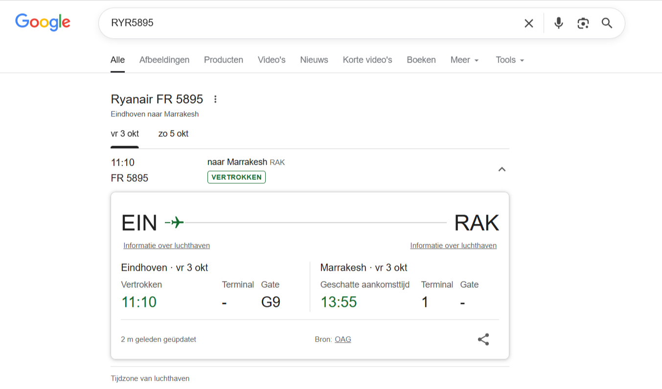 Je kunt snel het nummer van de vertrekterminal vinden door je vluchtnummer op Google te zoeken. Door het nummer in te voeren (bijvoorbeeld "RYR5895"), toont Google vaak de details van de vlucht, inclusief de terminal, in realtime.