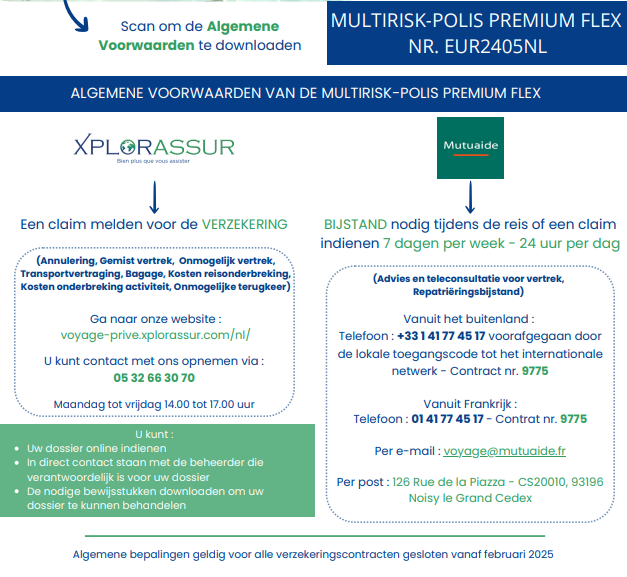 Bij problemen ter plaatse: medische kosten, repatriëring, ziekenhuisopname, ongeval, vervroegde terugkeer, aarzel dan niet om contact op te nemen met je reisverzekering.
