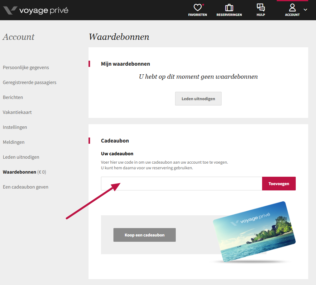 Om te beginnen voer je simpelweg de unieke code van je cadeaubon in het gedeelte Waardebonnen van je Ledenaccount in.